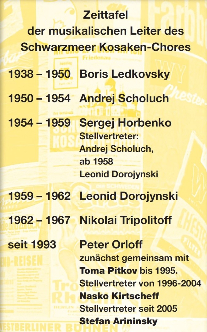Die Zeittafel der musikalischen Leiter des Schwarzmeer Kosaken Chores ist die Geschichte einer Legende. Die prägenden Persönlichkeiten waren dabei sicherlich der Gründer des Ensembles und erste Dirigent Boris Ledkowsky in den 40 er Jahren, der als er 1950 nach Amerika zum Leiter des Metropoltan Chores berufen wurde. Ein Ensemble auf höchstem Stand, hinterließ, das dann ganz entscheidend und beeindruckend von Professor Sergej Horbenko, vormals Dirigent der Kiewer Oper, weiter entwickelt wurde.